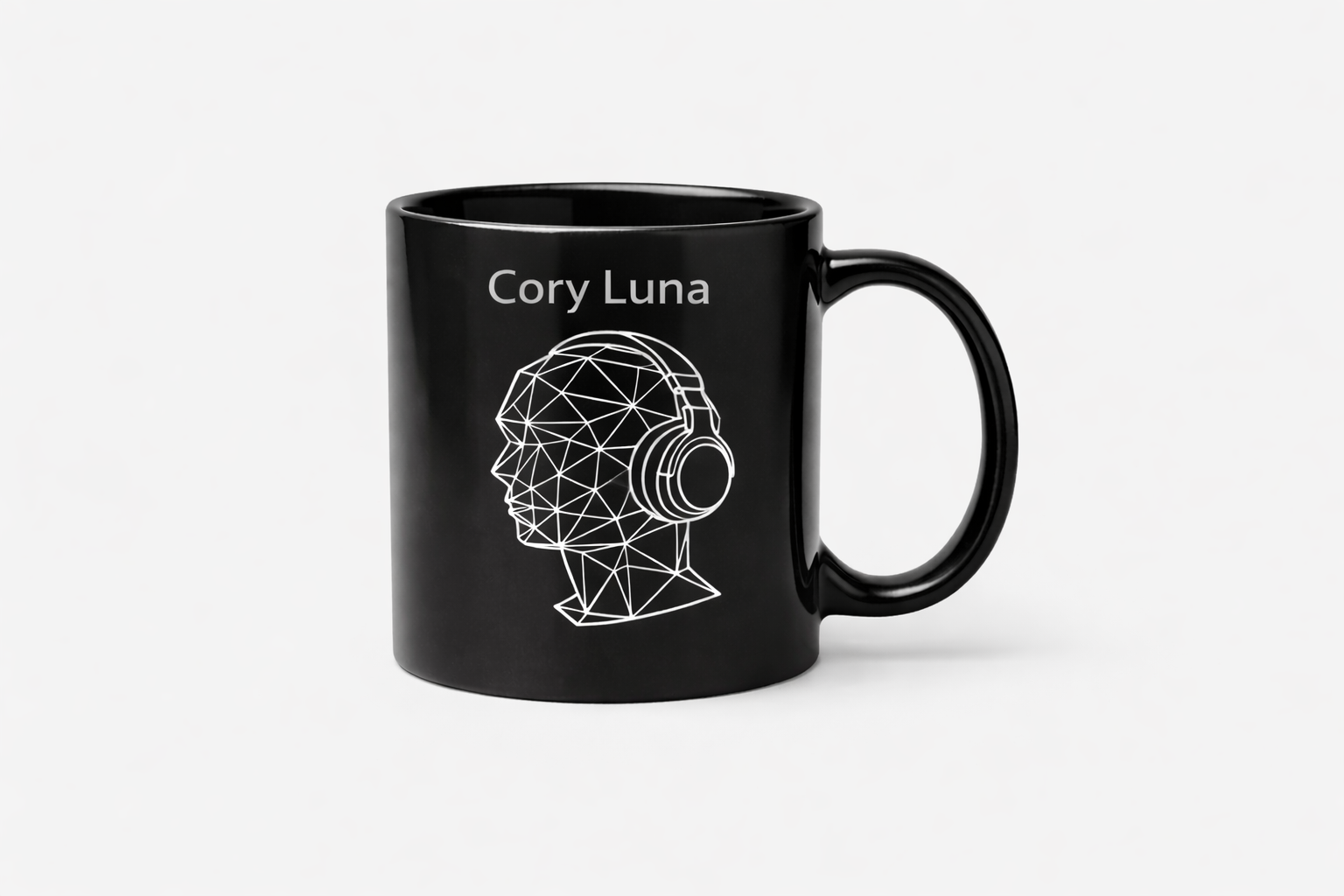 Cană ceramică cu logo Cory Luna. Înscrie-te pentru a fi notificat când se deschid comenzile.